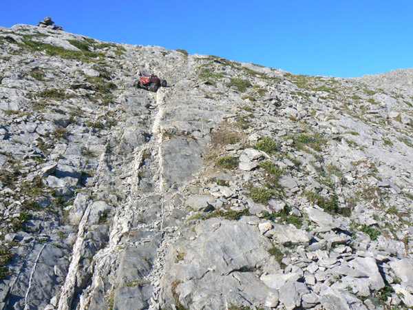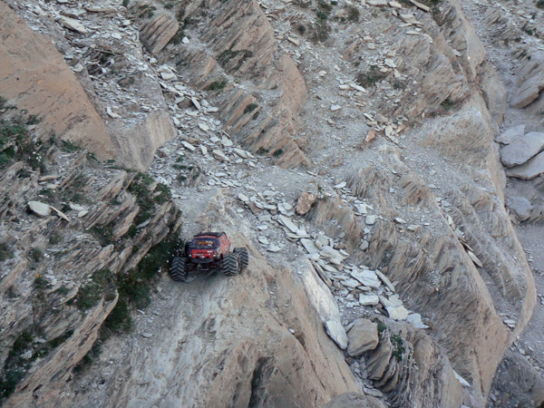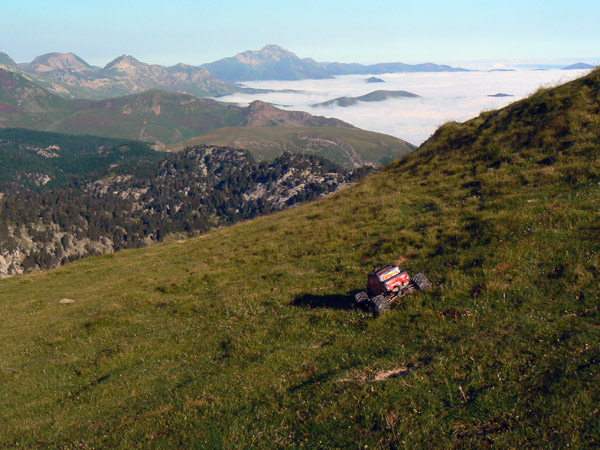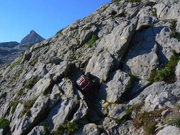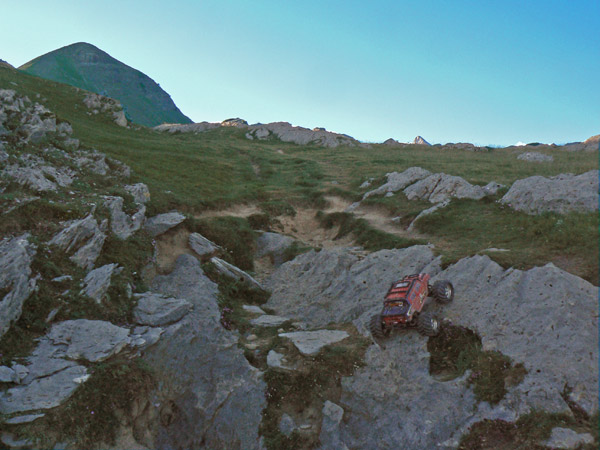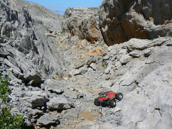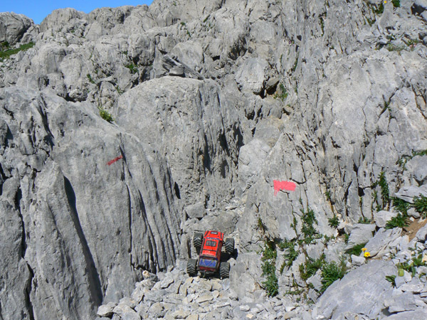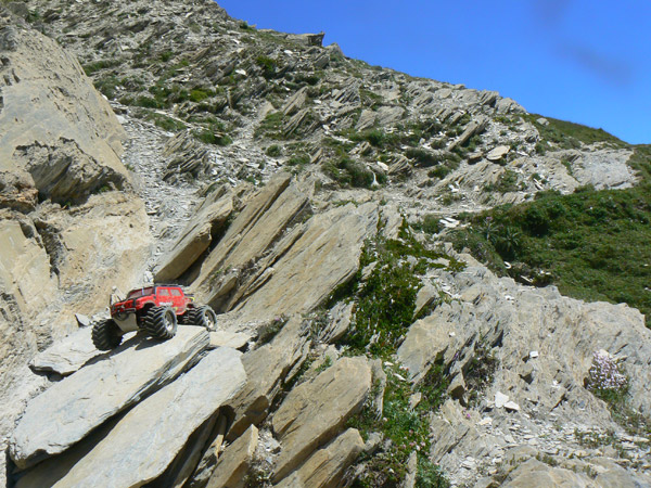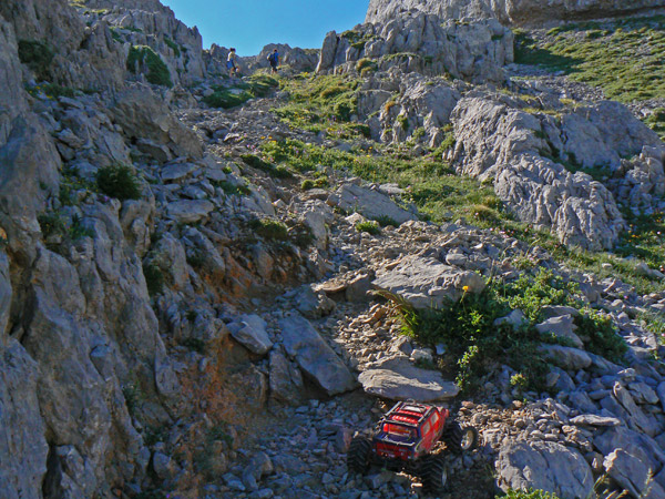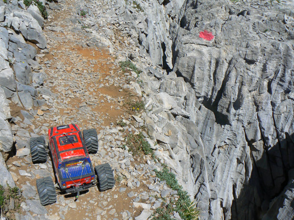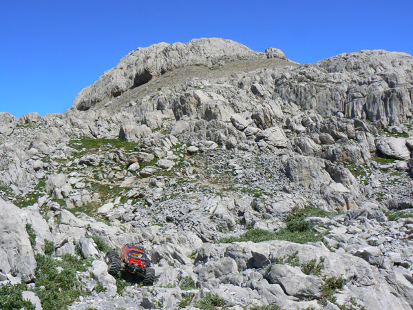 Regresamos Otra vez en busca de las marcas de pintura para llegar al primer collado. Regresamos. Adivinado camino entre las marcas rojas, muy atentos a la l inclinación lateral. El Emaxx se desenvuelve mucho mejor aquí, sobre terreno difícil pero abierto. Primera velocidad baterías nuevas y para arriba