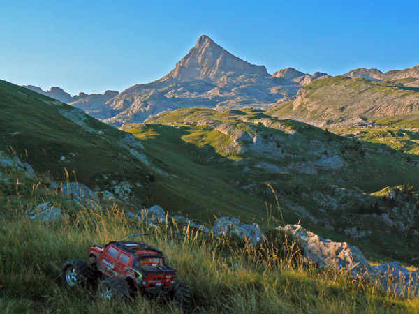 El Arlas. Llegamos a una parte con menos cuesta y al fondo vemos ya el pico Arlas que tendremos que bordear a media ladera. Llevaba colocada en el coche si no recuerdo mal un par de baterías antiguas, de 3000 Nimh, las únicas que me quedan de esa capacidad y que han tenido un rendimiento extraordinario a lo largo de estos tres años, ninguna ha aguantado tantos ciclos de carga y descarga como estas de marca Megatech Chris Chianelli. Aquí andaban las baterías chinas bien, una Turnigy Lifepo que al poco se hincharon. Cuando publico esta pagina, un par de meses después, una de las baterías chinas estaba ya inservible.