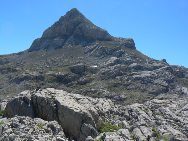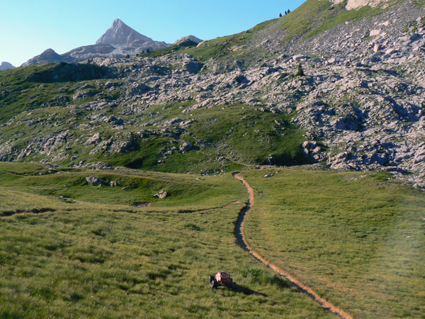 Hasta Aqui. Llega un momento en que el esfuerzo de pasar el coche ya supera toda afición y ganas, el Anie me vuelve a recordar que no debo venir por aquí con el coche. Decido pillarle un día por sorpresa subiendo por la parte francesa desde Lescun y el refugio de Laberouat, aunque ya veré si el que me sorprende es nuevamente el protegiéndose también con un karst por la vertiente norte. Ay!, doy la vuelta , no mirare atrás. Esa parte del Anie que vemos desde aquí es la silueta más conocida, se sube por la parte de atrás y la pendiente aunque fuerte no es insuperable para el coche.