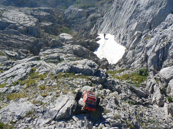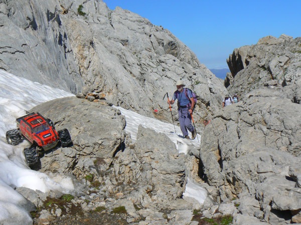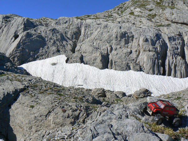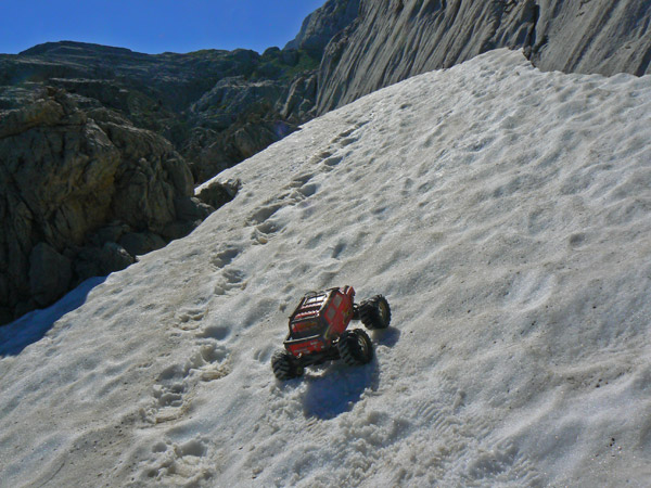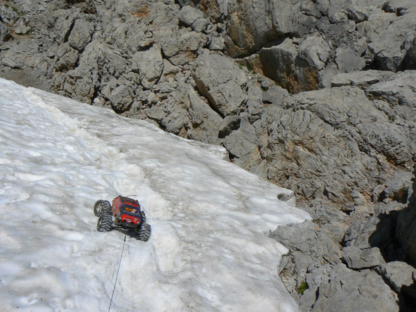 En la placa de nieve primavera ( verano mas que nada) No es que deba pasar el coche por aquí exactamente como única alternativa. Solo por jugar un poco. Y también para comprobar que la adherencia es CERO, nieve muy blanda y fundiéndose sobre nieve compacta muy vieja. Incluso andando y clavando bota tenemos que poner atención. El Emaxx solo anda tras un empujón y acelerando a tope en segunda, pero no seria capas de atravesar esta pendiente sin perder altura e iría a parar inevitablemente contra las rocas de abajo, un lugar al que no me quiero acercar mucho para evitar los ya comentados huecos y puentes que puede haber. Las huellas siguen por el centro y apoyándolo ligeramente en las botas conseguimos pasar.