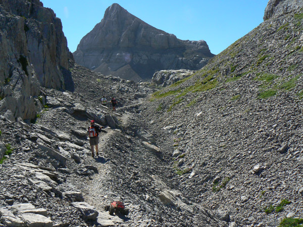 El Anie Destaca al fondo la pirámide de 2503 m de altura del Anie hacia la que nos dirigimos. Esta imagen está tomada desde el inicio del paso diagonal en la ladera de Arlas, queda un largo tramo de aproximación hasta el collado. Las tres o cuatro veces que he estado por aquí, en invierno o verano con el coche, me he encontrado todas las dificultades en el acceso. Caminar por el Karst de Larra ya es a veces complicado pero meterse con el coche de radio control en el que está poco antes del collado del Anie es casi una desgracia. De verdad que no veo camino ni ruta para pasar eso. Un mar de rocas de todos los tamaños, alguna necesitando un ligero apoyo de manos y el sendero poco menso que invisible. Solo unos hitos de piedra. Y cuidado porque hay varios en paralelo, nos llevaran hacia el collado después de muchas pruebas.