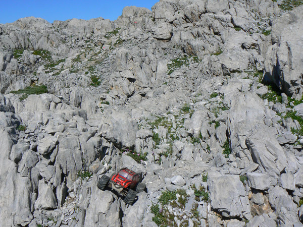 La veta Recuerdo otra excursión a esta zona con una foto en este mismo lugar, una gran veta blanca asciende en diagonal hasta el hito que podemos ver arriba a la izquierda. Sin dudarlo subo el Emaxx unos cuantos metros en primera marcha para hacerle una foto, antes tengo que ladearlo un poco para que aguante, estos coches no tienen freno de mano, y lo único que le retiene es la resistencia al giro en parado de los dos motores Integy 45T as 9,9 V, muchísimo menor que la de los motores Titán Originales a 14.4 V. Apriete el calor aquí en medio y empiezo a tirar de las botellas de isotónico que llevo a la espalda. Pondo los dos ventiladores de motor y variador electrónico de velocidad en marcha y de forma continuada. Normalmente aguantan unas 6 horas o algo más funcionando con una batería para receptor de 6 V y 1400 Mah. El variador no se caliente apenas, pero los motores si.