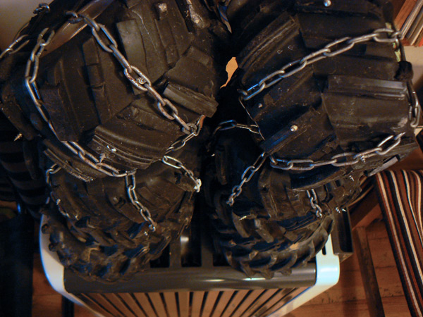 Calentando neumaticos. Otra forma de calentar neumáticos: la mía! No he encontrado de momento mejor manera para quitar el agua en las esponjas de los neumáticos, sin desmontarlos, que dejarlos una semana encima del radiador, antes ha habido que estrujarlos bien y expulsar la mayor parte. Andando como hago yo sin ningún cuidado por riachuelos, nieve o charcas es inevitable que se llenen de agua, no siempre bien limpia. También puedes desmontarlos y secarlos como es debido, pero si las gomas están bien adheridas a las llantas no es tan fácil. He impregnado las esponjas con spray antihumedad, pero como ya sospechaba, no es la solución, el agua rellena los huecos, no el material.