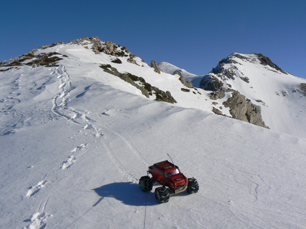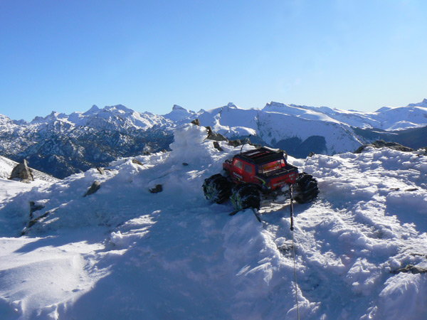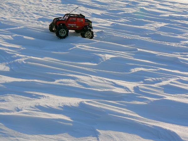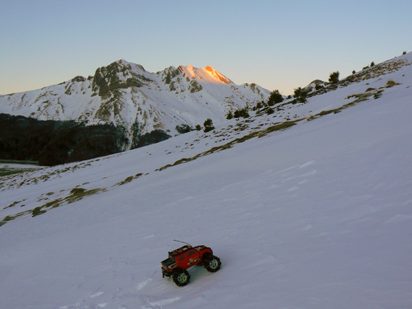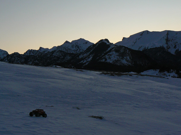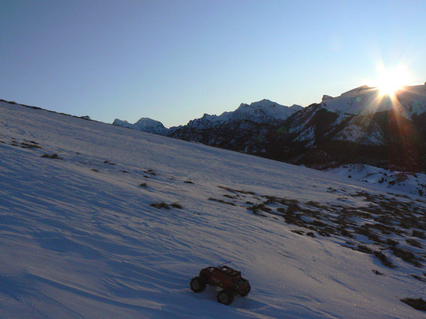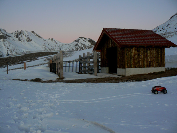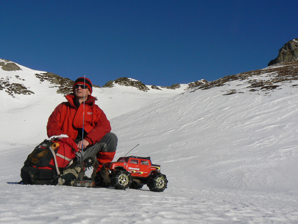 Los dos segundos En la primera toma de esta foto deje el timer a dos segundos, con lo que aparecía solo mi mano alejándose del objetivo. Aquí el protagonista de la serie, el Emaxx por supuesto, junto a mí haciendo las veces de conductor mecánico y fotógrafo a partes iguales. emisora protegida para poderla dejar sobre suelos húmedos y contra golpes en piedra, mochila con baterías, recambios , algo de comida y líquidos, y lo mínimo como ropa de recambio , una camiseta, calcetines y poco más. Crampones en las botas y polainas y una chaqueta media cortavientos e impermeable , guantes gorro gafas y listos para reemprender la marcha. Detrás se ve la llanura donde esta el lago helado y cubierto de nieve.