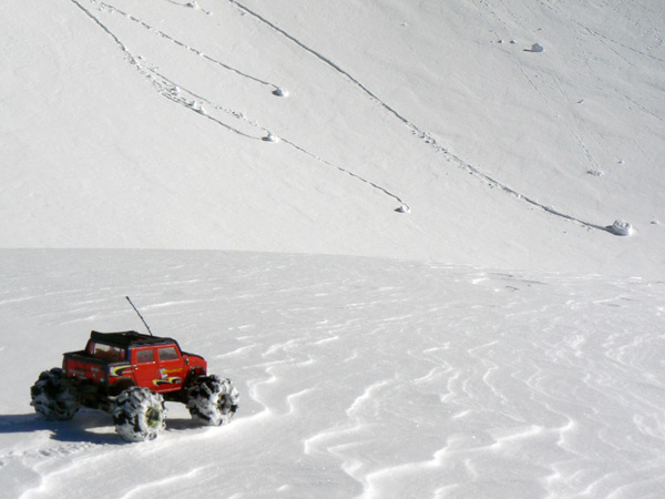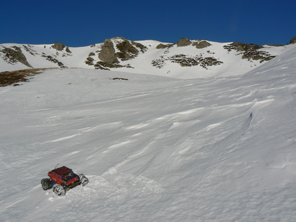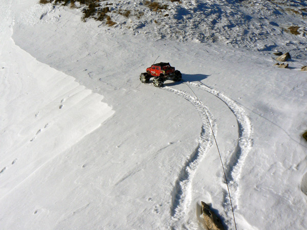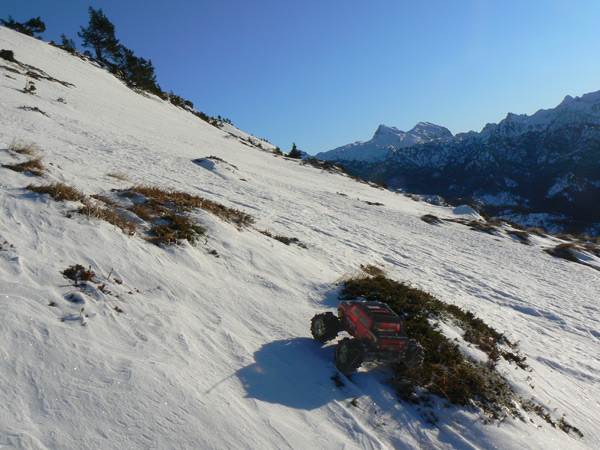 más de bajada Aquí estamos en plena faena. si me fiara totalmente de unos 100 metros de alcance de la emisora dejaría el Emaxx suelto, probablemente podría conducirlo hasta el fondo de la vaguada sin demasiados problemas, pero la emisora que llevo o el receptor empieza a hacer cosas raras a partir de los 35 o 50 metros, y no siempre. Sea como sea no es lugar para probarla. Decido bajar por tramos de 5 metros cada vez . No progresando al mismo tiempo que el Emaxx sino por turnos, al menos hasta que la pendiente se suavice y se vea clara segura la derrapada final en medio del valle, ya abajo. De momento y aun bajando con precaución esta primera parte, el coche ya baja derrapando lateralmente. Es quizás lo único que me falta por solucionar en cuanto a hielo y nieve , evitar el deslizamiento lateral, algo bastante difícil con el dibujo actual.