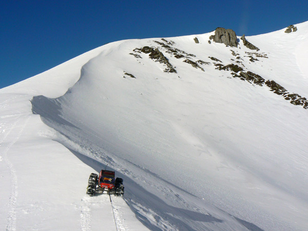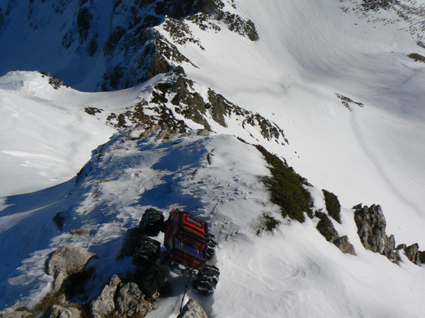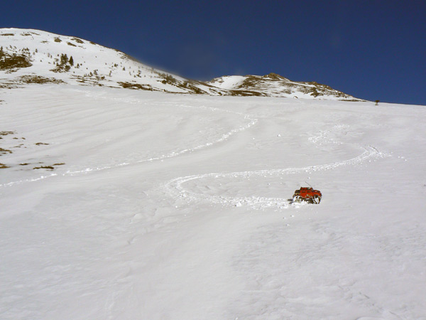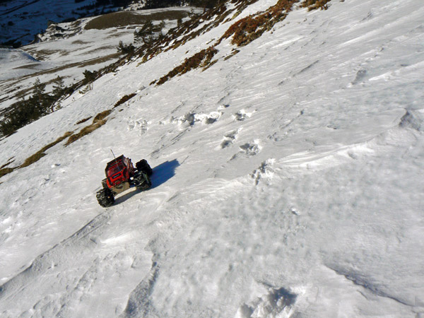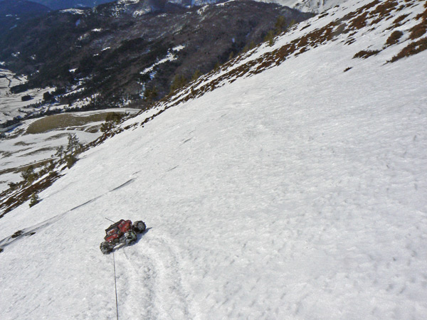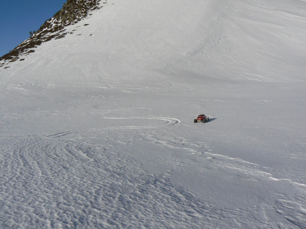 En mitad de la diagonal Estamos más o menos saliendo de la primera subida y encarando una de las partes algo delicadas para el coche, Asi entramos de nuevo en zona de cero errores, yo cometí dos y casi se me multiplican por 5. Primero, no llevar al principio de la diagonal el coche asegurado. Segundo : Avanzar al mismo tiempo que el coche,. De repente se produce un resbalón de una bota con bolanieve bajo los crampones - a pesar del anti-boot - y tengo que mover rapidamente el otro pie para mantener el equilibrio.. Eso me hizo bajar instintivamente las manos al suelo y perder el control del coche unos instantes , éste empezó a retroceder por la línea de máxima pendiente, si no lo paraba en los siguientes dos o tres segundos seria demasiado tarde y si apretaba un milímetro de más el acelerador se encabritaría y volcaría hacia atrás, en cualquier caso perdía el coche ladera abajo , incluso a diez o quince metros más abajo de este punto ya habria sido lioso ir a recuperarlo. Tuve la suerte de poder darle justo al acelerador para que levantara morro y antes de que volcara soltarlo para que bajara y mantuviera la posición. A partir de ese momento lo aseguré.