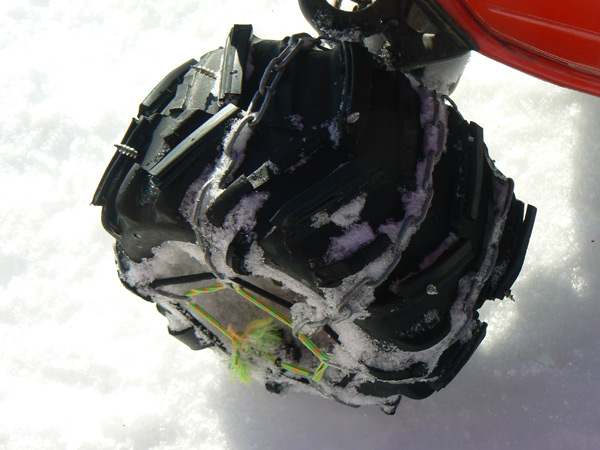 Parada y detalle de los neumáticos. En el mismo collado, decido hacer una larga parada , desayunar algo ligero y tomar liquido, no suelo estar nunca mucho tiempo pero esta vez el paisaje , la temperatura y el sol invitaban a permanecer ahi un poco más dejando correr el tiempo. Aprovecho para sacar un primer plano a los neumáticos que me han permitido llegar hasta aquí sobre hielo y nieve durante más de una hora. Tirafondos de 3*15 mm insertados desde la parte interior, no más de dos en contacto con el suelo por rueda, realmente arañan el hielo y cogen adherencia en cualquier superficie que no sea piedra lisa. Cadenas, en hexágono sujetas con goma elástica por fuera y bridas de plástico por el interior, no demasiado útiles excepto en una nieve poco compacta o hielo granizo.. Nervios de neumático realzados 1 cada 2. Se elimina uno de cada dos y el restante se realza, imprescindible en nieve blanda t barro. Hasta el momento es la combinación más efectiva probada en hielo y nieve helada. Inconveniente no puedes rodar a alta velocidad, debes salir ya con esto puesto y bajarlos del coche 1/1 en una zona ya nevada o próxima a la nieve. Son bastante patosos fuera de ese medio aunque también he circulado sobre pastos, tierra suelta y piedras.