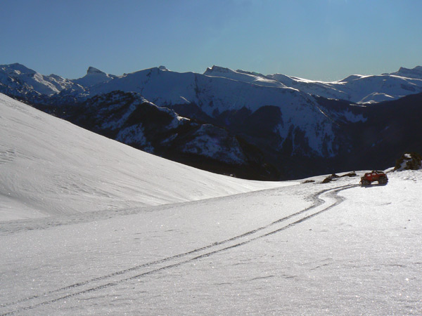 Ultimos metros Ya estamos como quien dice arriba, según la foto anterior poco antes de las eses finales. La tracción es excelente en este terreno , por las huellas que están dejando los neumáticos, probablemente la mejor de toda la ruta, estamos a mil setecientos metros, y eso en el mes de enero es un lugar donde puede llegar a ha hacer muchísimo frío por la noche si esta despejada. Ligeras marcas pues sobre la nieve, más que las que dejan mis botas y crampones . Debe resultar sorprendente para cualquiera ir subiendo por aquí y de repente encontrarte unas huellas separadas 35 cm. con la típica forma en chevron de los tractores , alguna mordida de cadena y algún arañazo de los clavos.. |