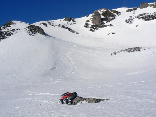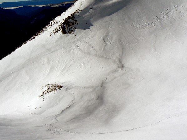 Mirando la pendiente Estamos en el filo soleado de al anterior imagen, ahora se trata de buscar el mejor lugar para girar a la izquierda y lanzarnos pendiente abajo. La nieve esta blanda como para bajar clavando talones y a grandes zancadas , algo no muy aconsejable llevando crampones, pero de momento decido dejarlos puestos aunque en realidad ya no son necesarios en zona soleada. Esto me lleva tres o cuatro idas y venidas mirando de reojo hacia mi izquierda bajando o a mi derecha cuando subo con tal de encontrar y decidirme por el mejor lugar donde dar el volantazo. No me decido pero ya he visto dos lugares que parecen apropiados.