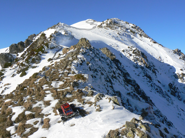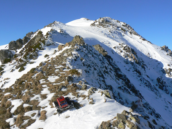 Hacia la antecima del Cortaplana. Estamos llegando a uno de los lugares más bonitos y espectaculares de toda la ruta invernal para este Emaxx . Un pequeño collado entre los montes Lakora y Cortaplana , la nieve acumulada por las ventiscas cerca del cordal es una mezcla de nieve polvo con otra más compacta. Es en ese punto fue difícil encontrar la buena ya que engañaba a la vista. Totalmente blanca y cegando con la luz del sol reflejándose tras la explosión de luz. esta subida no tiene ninguna dificultad, es de tal belleza que se hace casi sin pensar ni mirar, si acaso solo de reojo, la vaguada que queda a nuestra izquierda profunda y de pendiente directa muy fuerte para el Emaxx, no debe caer hacia ese lado, Llevo otra vez el coche sin asegurar pero será por poco rato.