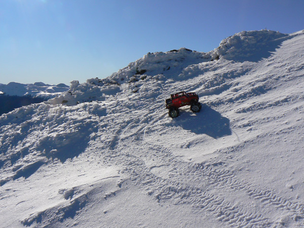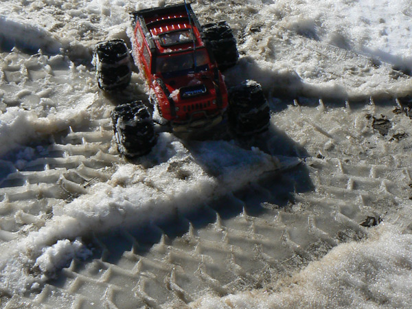 buscando la minima pendiente. En la foto se aprecia claramente todo el itinerario seguido por mí y el Emaxx para llegar a este punto. Empezando en los zigzag de la primera cuesta, la que veíamos dos cuadro más arriba , sigue la bajada al llano un acercamiento a roca para expulsar la nieve adherida. Un poco más adelante intentos muy próximos de encarar la pendiente , todos sin éxito. La nieve en esta zona estaba muy blanda y en cada ocasión he tenido que meter la marcha atrás y retroceder hasta la huella principal, Tuve que estar después del 4 intento un buen rato estudiando la zona e imaginando el mejor paso. Curiosamente resultó ser uno con mucha más pendiente que en la zona baja , pero también con la nieve mucho más compacta, es increíble la inclinación que pueden subir estos neumáticos sobre hielo o nieve cristalizada , llega incluso a volcar el coche si en plena pendiente intentas hacer un caballito. Es un pequeño couloir, o corredor hecho a escala del Emaxx, todo es más reducido aquí, y un pequeño desnivel de 50 metros se antoja mucho más largo , por laborioso que resulta a veces el poder superarlo.