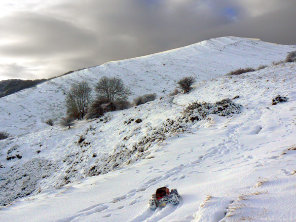 Saliendo del bosque hemos de tirar un poco hacia la derecha, por una cuesta llena de matorrales, ahora de nieve, a menudo con mucho barro y de camino impreciso.