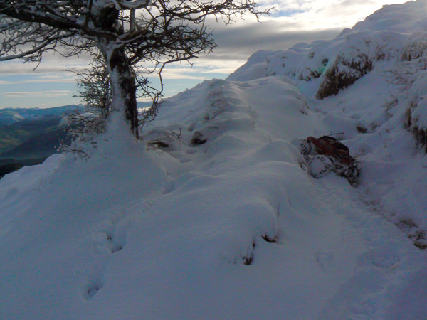 Una fina capa de tres centímetros de nieve cubre el sendero que nos llevara al colado de Zelatún, no es la nieve que mas me hubiera gustado encontrar, pero tan cerca de casa y a esta altura no podemos ser muy exigentes.