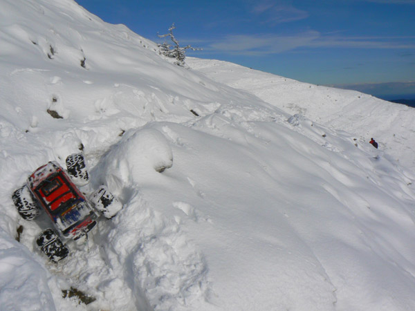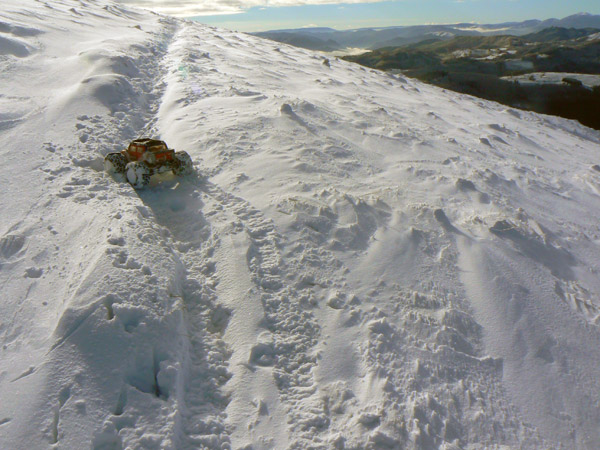 Ya parece difícil haber llegado hasta aquí en estas condiciones de nieve con un coche eléctrico de radio control, un poco especial eso si, pero que no deja de ser un coche miniatura con los ejes a 8 cm solo del suelo y poco mas d 5 kilos de peso.