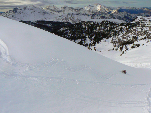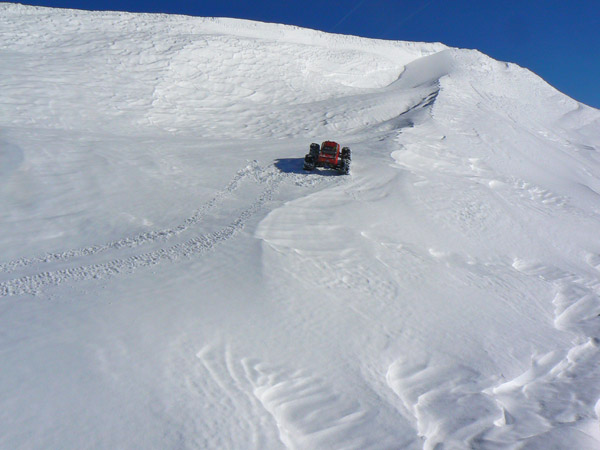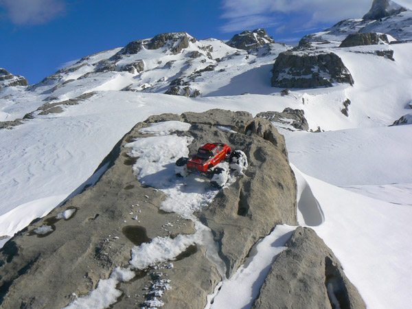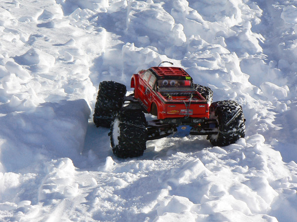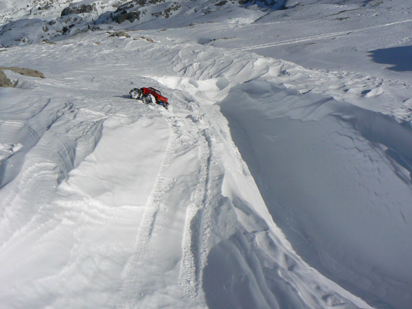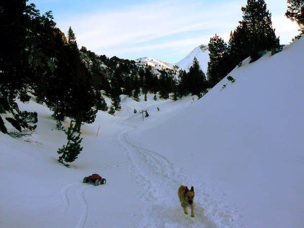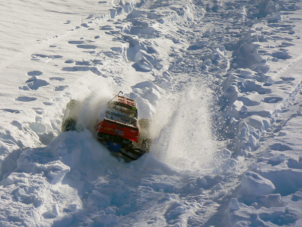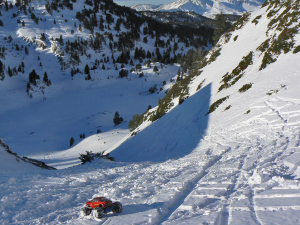 Curiosa forma de bajart la pendiente nevada con un 4x4 de radiocontrol, comova deslizando por la diagonal a medida que baja ponemos primera velocidad hacia adelante y golpe de marcha atras al pasar de Zig a Zag !