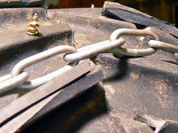 Neumaticos con cadenas artesanales y 10 tirafondos de 3X15 mm por rueda a modo de clavos insertados desde dentro del neumatico hacia afuera.
