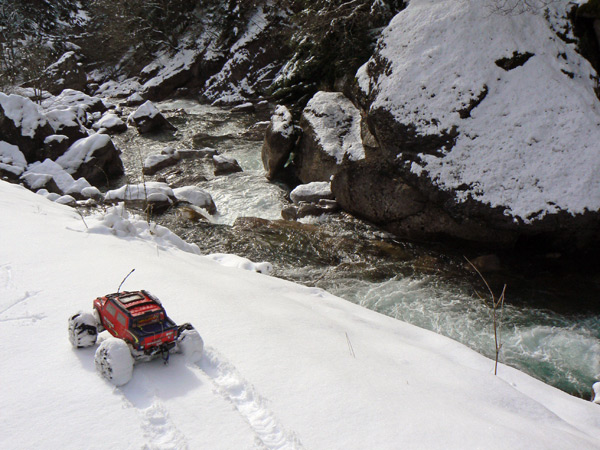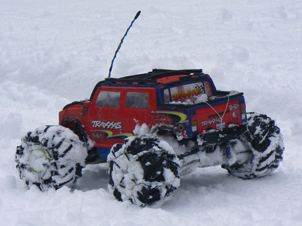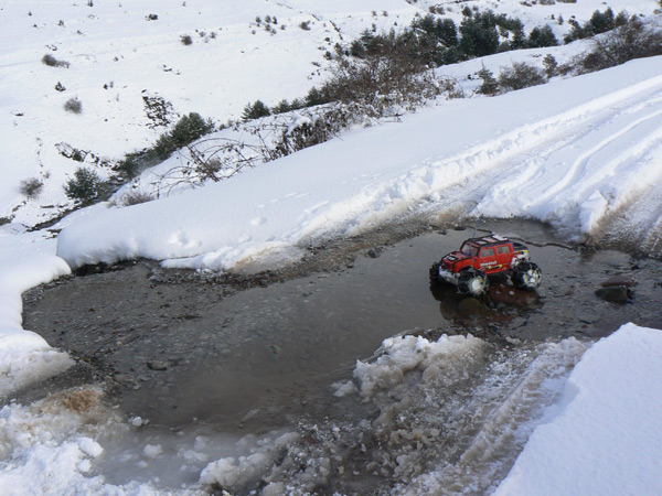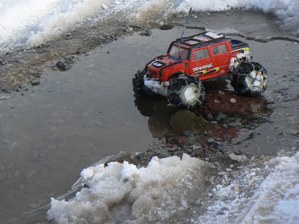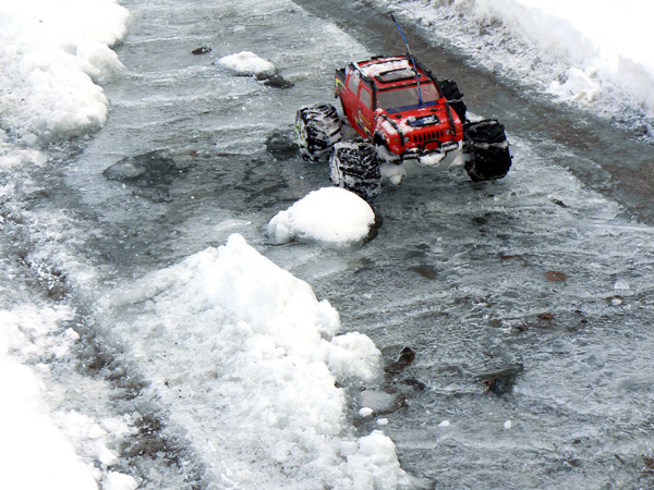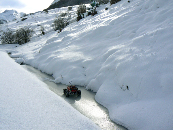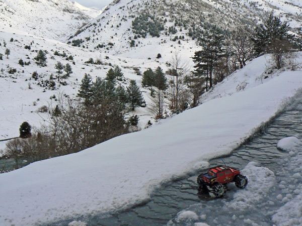 y de hielo No puedo resistir la tentación de pasar por encima de estas charcas heladas cercanas a la pista, son una mezcla de hielo y granizo pero bien firme. No puedo saber el grosor de la capa ni la profundidad ya que no es del todo transparente, espero que aguante y que no haya un palmo de agua debajo. Me arriesgo a remojar el Emaxx y entro despacito primero una rueda luego la trasera y giro para hacer todo el tramo. Avanza perfectamente y la capa aguanta muy bien los 5 Kg. largos, quizás 6 del Emaxx. De todos formas paso con mucho cuidado, sin apretar gas apenas