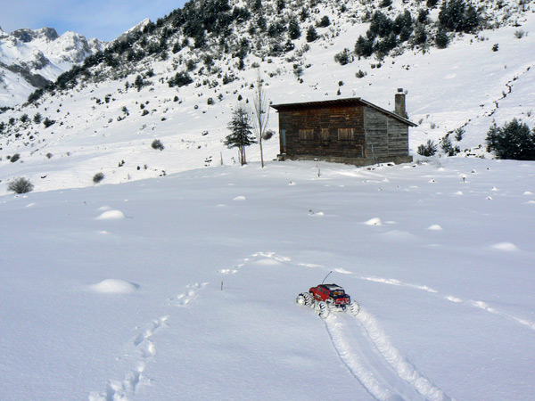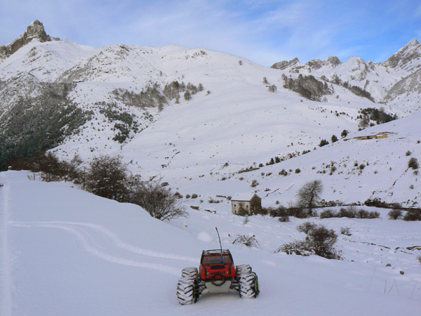 Chipeta y barranco de Acherito. No siempre puedo seguir las huella de los hermanos mayores 4x4 que han pasado por aquí durante la nevada ,ayer por la tarde. Si hubieran tenido ruedas un poco mas anchas o hubieran abierto varias trazadas me facilitarían mucho la subida . Tal y como han dejado la pista , muy a menudo tengo que andar con un lado del Emaxx subido en la parte alta de la huella y el otro en la parte baja , a partir de 20 cm. de diferencia de altura entre lados conducir el Emaxx es un poco mas fatigosa , hay que estar muy al tanto de que no baje o que no se quede con el borde tocando el eje. Es como conducir con la rueda por encima de una cinta de 5 cm. de ancho con el coche inclinado 30 grados y no salirse de ahí. Siempre es mejor abrir huella , aun a costa de un mayor consumo de baterías. Este coche flota bastante, es decir los neumáticos apoyan bien y firmemente en la nieve helada o algo blanda, es raro que a primeras horas de la mañana se hunda hasta el chasis.