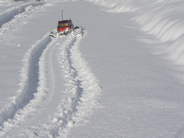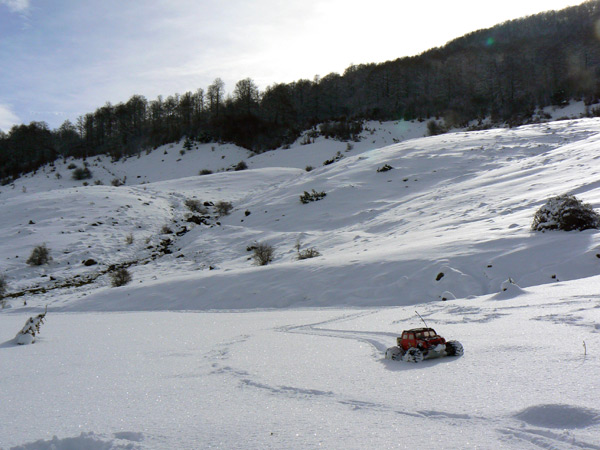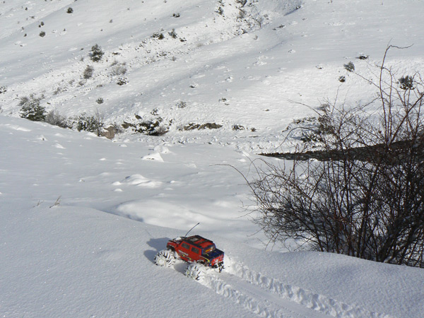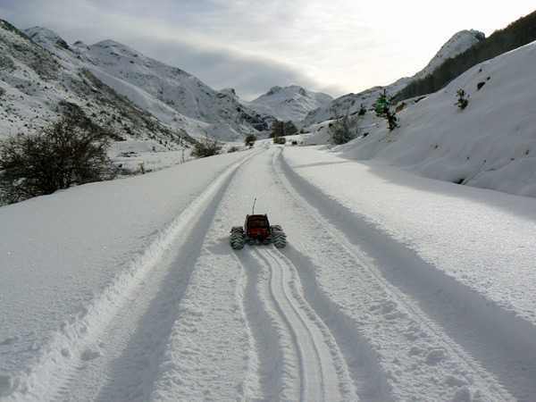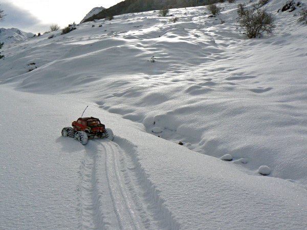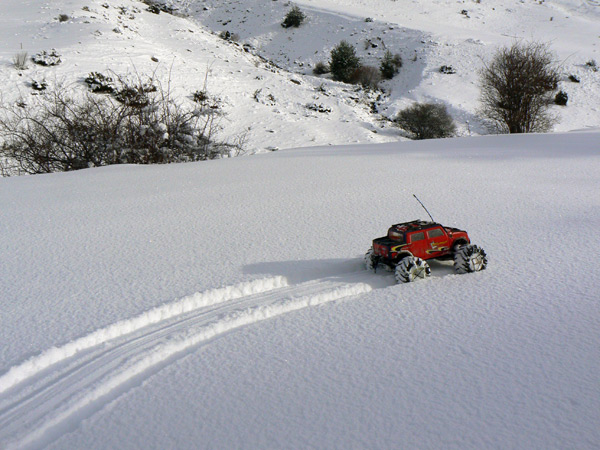 Aumenta el espesor de la nieve, la altura de la huella y el hundimiento del Emaxx que mas parece un buque escorado que un coche RC. En este estado de nieve El Emaxx solo es capaz de bajar y arrastrar con la panza la nieve mientras sobren baterías. En la posición en que está le cuesta muchísimo salir, avanza centímetro a centímetro y al final queda levantado por los protectores de bajos y se ve flotando. Estoy a punto de amarrarlo con la cincha de seguridad y tirar de el, pero finalmente la bajada ayuda y puedo andar a trancas entre la huella y la parte central de la pista. |