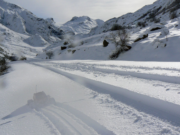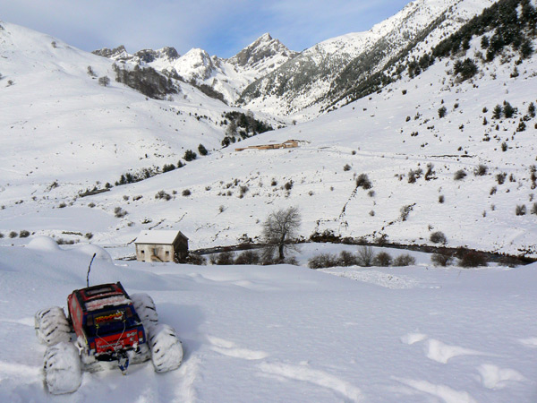 Al fondo lo que deberia haber sido el inicio de mi ruta, por lo menos en montaña, la cabecera del valle de Guarrimza y la entrada a Aguas Tuertas para seguir hasta el Ibon de Estanes. Evidentemente con cuatro dobles packs gastados para llegar hasta aqui empujando nieve no iba a llegar ni al final de la pista, y ya veriamos al bajar si con las baterias mas flojillas podria alcanzar el camping sin cargar con el Emaxx a cuestas. A escala un 4*4 de los grandes se las veria abriendo huella con un paqueton de nieve hasta la mitad de su neumatico..