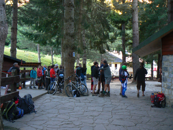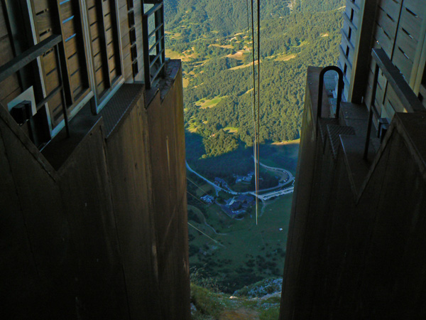 Up, nos comemos 750 metros. Desde la estación superior del teleférico 1640 metros de cable salvan un desnivel de 750 metros y son subidos en poco más de tres minutos y medio . Nos eleva hasta 1450 m. La sensación de vacío es impresionante, en especial al salir de la estación inferior que se aleja 10 metros cada segundo y al acercarnos a la pared , cuando mas parece que vas en un ascensor en vez de un teleférico. Las antiguas cabinas de hierro ha sido cambiadas hace ya algunos años por unas con paredes de cristal . Les faltaría el suelo de vidrio laminado para darle más emoción al viaje pero no quiero dar malas ideas a nadie ... Los dos primeros viajes del Teleférico [ 09:00 y 09:05] admiten bicis , que luego pueden disfrutar de una impresionante bajada por pista hacia Espinama o más larga hasta Sotres. Aparte de las bicis solo cabemos yo y tres más en el primer viaje, y el empleado de cabina, que va medio dormido y con una cara de aburrimiento tal que es capaz de quitarles la emoción y la adrenalina a todos los pasajeros con una sola mirada. Cuantas veces habrá escuchado lo de " y si se cae ahora" ?. Las cabinas cuentan con unas asas agarraderas en el techo, como en los autobuses urbanos, espero no tener que utilizarlas nunca.