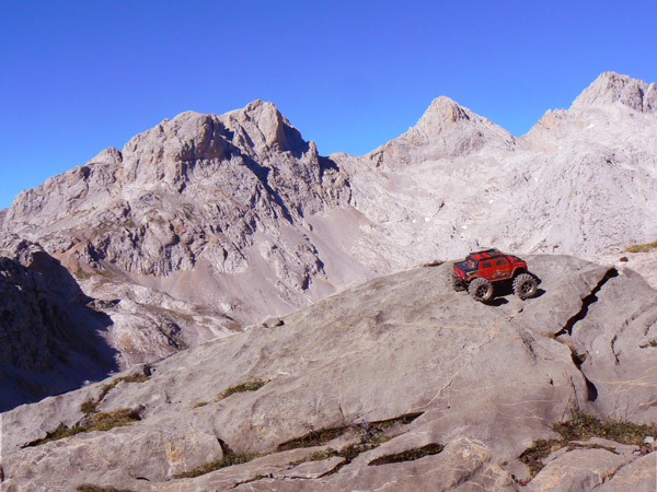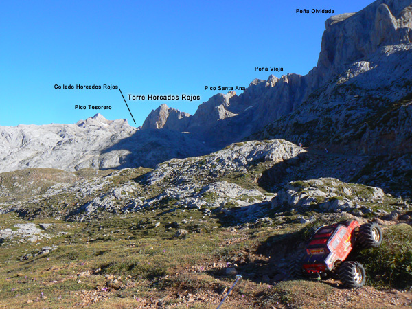 Tesorero, Collado de Horcados Rojos y Torre , Peña Vieja No estoy muy seguro pero pienso que los picos que vemos al salir de la estacion sup. del teleferico (El Cable) son estos , todos rondan los 2500/2600 m de altitud.. La idea es subir a la Torre de los Horcados Rojos, esa punta al fondo de la foto, por ese collado que está entre la cima y el pico Tesorero. Pero eso queda aun muy lejos para un coche eléctrico de radio control escala 1/8. No es un coche de los que podamos comprar en los hipermercados antes de navidad. Pesa unos 6 kilos y es muy robusto y fiable. Todas las piezas pueden ser sustituidas y existen infinidad de mejoras y accesorios. Rueda con dos motores eléctricos , actualmente dos Integy 45T, con voltajes entre 7,2 y 12 V. Tracción a las cuatro ruedas, diferenciales bloqueados, embrague, dos velocidades, variador electrónico, emisora de tres canales de largo alcance. Lleva 8 amortiguadores , dos por eje con aceite de silicona en su interior, son regulables en precarga, ángulo, posición, altura y dureza al paso de aceite. Neumáticos con huella Chevron V de goma de compuesto medio ,rellenos con esponja y con recorrido de suspensión de 70 mm. Desde la misma salida del teleférico seguiremos una única pista de tierra y piedra cerrada al tráfico , en quince minutos nos lleva hasta la Horcadina de Covarrobres [ 1930 m] que reconoceremos por que la pista se divide , la de la derecha baja hacia refugio-hotel de Aliva y la de la izquierda hacia el collado de Horcados, que seguiremos. Aun la seguiremos otros quince minutos para llegar a una curva de casi 180 º conocida como la Vueltona en que la pista continúa hacia las minas de Altaiz. |