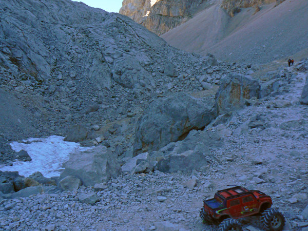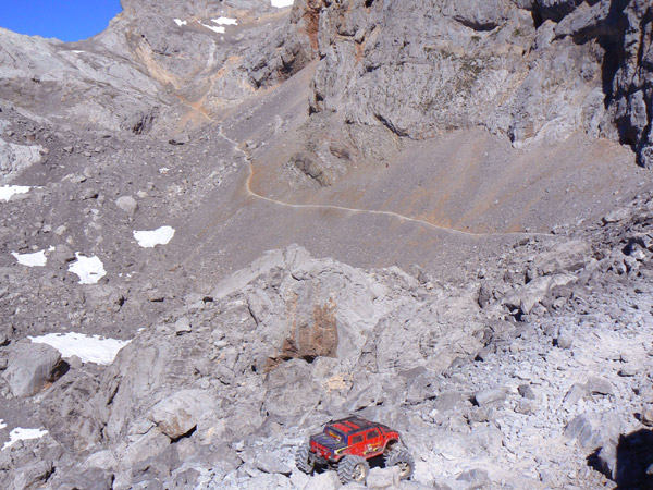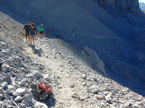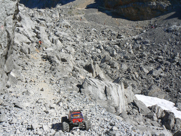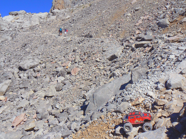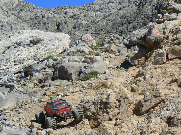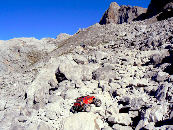 UItimos metros Los últimos metros para el coche antes del collado de Horcados son como la traca final , aparecen piedras de todos los tamaños y en todas las posiciones . Subimos bien pero ya no tan descuidados como antes, aquí andaremos poniendo primera y despacito, buscando bien el hueco donde poner rueda. Normalmente , a menos que queramos estar ahí toda la mañana lo cogeremos a mano un par o tres de veces para dar dos zancadas o elevarlo a la altura del resalte. Al contrario de otras disciplinas del hobby como el crawling o coches a escala con neumáticos 2.2 o 1.9 " A qui no se caen los anillos ni se pone el grito en el cielo cuando hay que arrear con los 6 kilos del coche en una mano para arriba , aunque como podéis imaginar por el peso y lo incomodo de llevarlo balanceando en una mano se buscan mil formas de pasar antes de tener ni siquiera ganas de llevarlo a mano