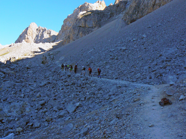 Pocas sombras. 2240 m Y llegamos a una de ellas, hay un momento al salir del primer carrizal que nos acercamos mucho a una pared que suele dejar una buena sombra en la base , por lo menos hasta mediodía Hay varios grupos de montañeros tomando algo de liquido y pegados a la pared, después de la ultima subida se agradece esta sombra y pequeño descanso. A pesar de la pendiente que vemos en la foto tampoco hay dificultades para el coche en subir esto, lo sube más rápido de lo que la mayoría de nosotros podríamos y mantendría la velocidad por encima de 8 o 9 Km. hora en la mayor parte del trazado .
