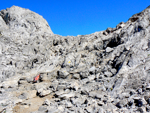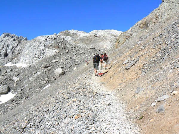 Enlazando carrizales , 2220 m. Entre ambos se distingue este tramo de enlace. He subexpuesto ligeramente el camino para que se aprecie un poco mejor por donde va , aunque no hay perdida. Encontré un grupo bastante numeroso a la sombra de esa pared. Ahora no lo distingo del todo bien pero creo que de la primera curva sale hacia la derecha el camino a Peña Vieja por La canalona. Luego, a la bajada del collado, como andaba fresco y sobraban baterías lo seguí un rato , pero desde esta imagen no puedo asegurar que sea ese. Si venís por aquí lo veréis fácil,y está indicado con unas pintadas en la roca.