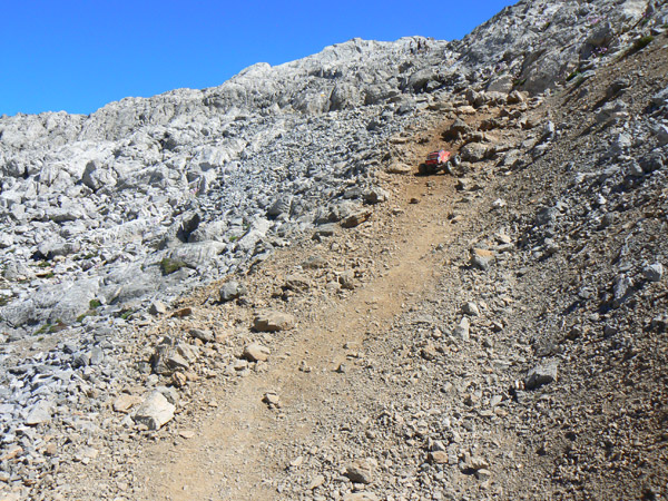 Bajada a segundo carizal y collado al fondo. Desde la misma sombra cercana a la pared comenzaremos un sorprendente y corto descenso hasta encontrar el camino que vemos en la imagen y que atraviesa la segunda gran tartera antes de elevarse definitivamente hacia el collado que vemos al fondo de la imagen un poco a la izquierda. El coche no se detendrá por si solo en caso de vuelque lateral y caída por la ladera que vemos ahí abajo, así que podemos pensar en asegurarlo por primera vez. Yo lo hice todo sin asegurar , el camino es relativamente ancho en la mayor parte del siguiente tramo.