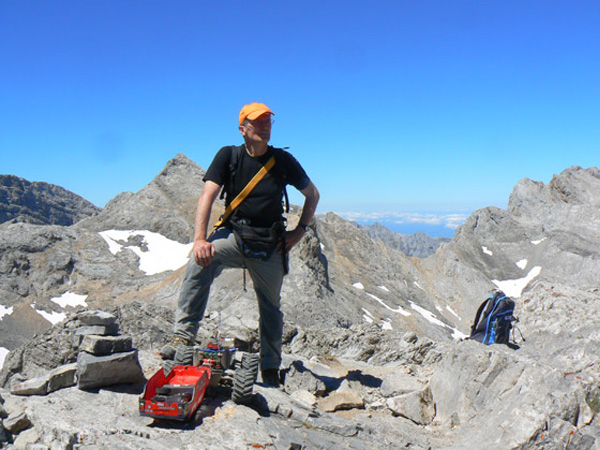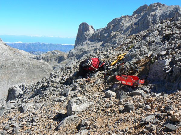 Del collado de Horcados Rojos a Torre Horcados y regreso . Subir a la torre de Horcados Rojos a pata es ruta familiar casi. Subir un coche de radio control eléctrico de radicontrol, por muy preparado que lo lleves es otra historia. Descansamos y comemos algo en este punto, un poco más arriba del collado de Horcados Rojos, ya subiendo la ladera de la Torre. El coche aireándose y refrescando un poco los motores. Detrás el inconfundible pico Uriellu, más conocido fuera de la zona como Naranjo de Bulnes , y abajo los increíbles Jous de los Boches y Sin Tierre