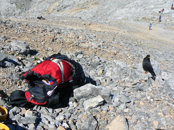 Se invitan a comer las chovas piquigualdas Todas las que se acercan están anilladas, veo una marca V61 sobre anilla blanca en la pata izquierda. Estoy comiendo un coctel de frutos secos y de vez en cuando dejo caer alguno pequeño, rueda entre las piedras y antes de perderse en alguna grieta un pico amarillo lo atrapa, lo tiene unos segundos dando vueltas por el pico y si ve que pasa lo engulle Sigue andando gente por el collado hacia el Cable o hacia Vega Urriellu. Aun no he puesto ninguna de las baterías Lipofe Turnigy que últimamente se han hinchado y perdido mucha capacidad. Cojo la Turnigy más mala, marcada como R2, y la coloco. Después de descansar un poco decido intentar las subida a la Torre de Horcados Rojos, sin ninguna dificultad para subir a pata pero realmente más complicada para este cochecito.
