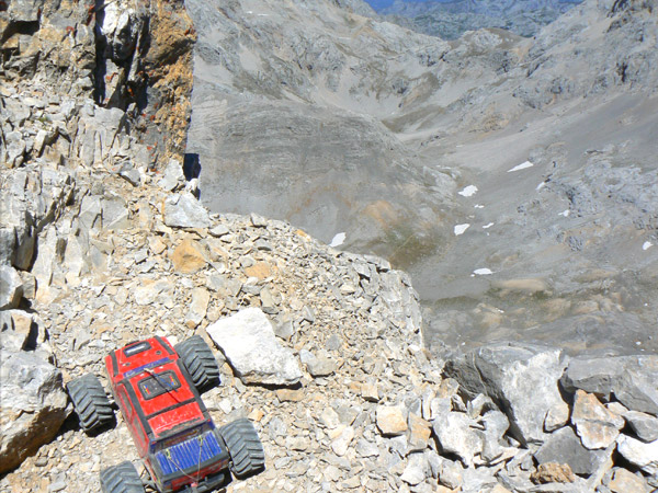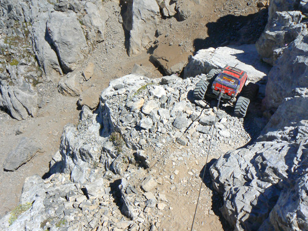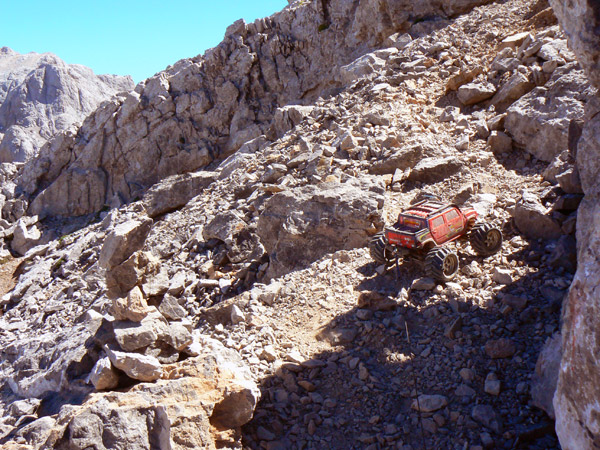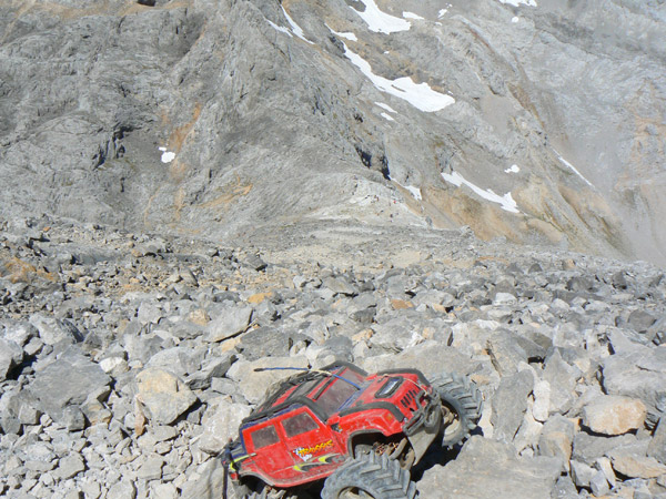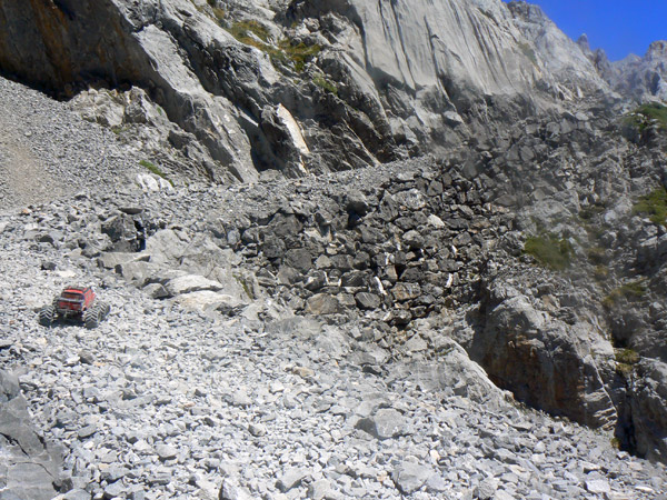 Bajando por el sendero de Peña Vieja Exactamente en la ultima tartera antes de enlazar con el sendero que va del Cable a Cabaña Verónica. Curioso y muy delicado paso enfrente el Emaxx por el que apenas si caben las ruedas, a la subida ya se me deslizo la rueda trasera derecha pendiente abajo pero pude cogerlo a tiempo. A la bajada opte por hacer un paso rápido para evitar que tuviera tiempo a caer hacia el valle. El camino que baja de horcados debería verse por ahí al frente, al final de la tierra ocre, pero en la foto no llego a distinguirlo, ah si, ya veo el sendero como un hilillo claro muy abajo a la izquierda, lo que no se ve es el entronque de ambos.