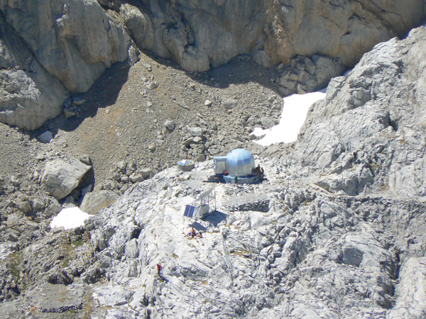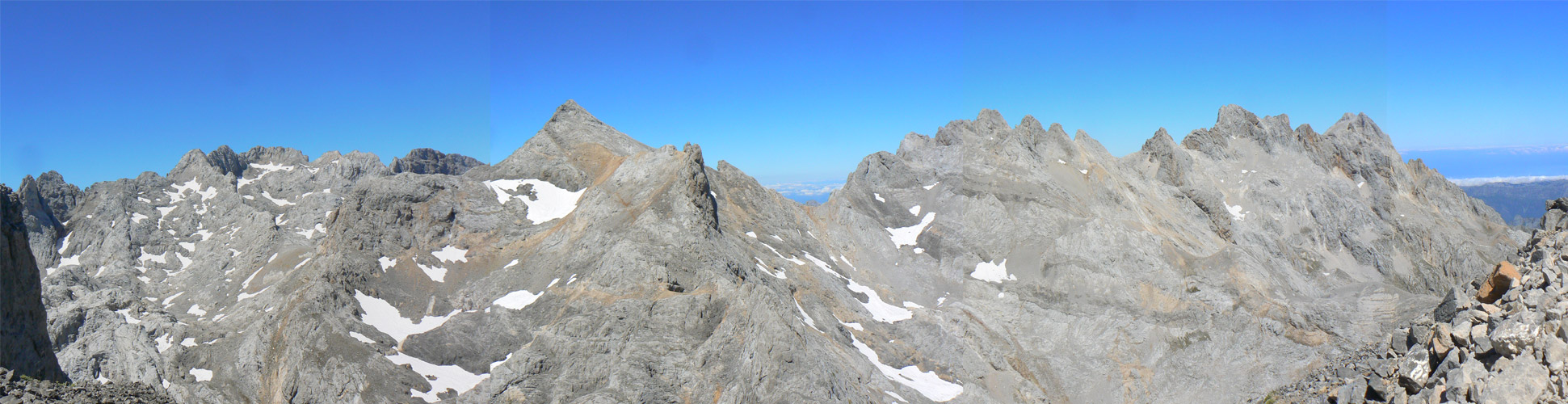 Desde la cumbre , zoom sobre cabaña Veronica Tirando un poco de zoom óptico lograba esta imagen del refugio vivac de cabaña Verónica con bastante gente en los alrededores. Las vistas desde la cima son impresionantes hacia el pico Urriellu, los Jous de los Boches y de sin Tierre y por el lado de donde venimos, hasta la estación superior del teleférico, incluyendo el cordal de Peña Vieja y Peña Olvidada
