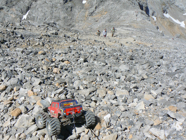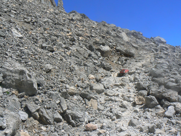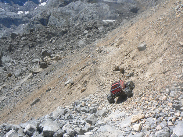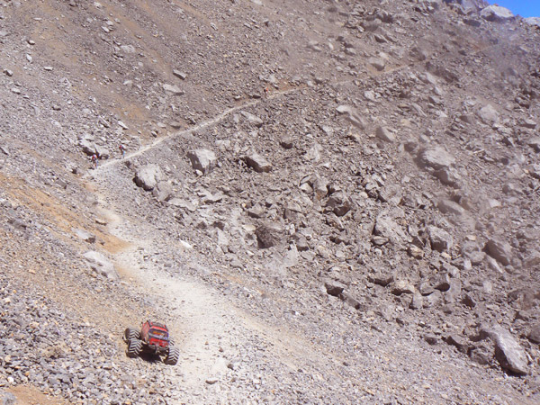 A media ladera vemos muy abajo el collado de horcados, y si nos fijamos bien descubriremos unos puntitos rojos que son gente descansando. La pendiente es más que gorda para el Emaxx y si bien subiría sin problemas con buena adherencia, sobre este terreno de piedras es algo difícil. Por supuesto que es una de las pocas subidas que tengo que hacer con el seguro puesto. |