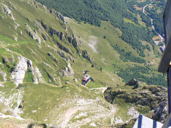 Solo tardaremos tres minutos y cuarenta segundos, a mitad de camino nos cruzaremos con el que sube y que entre ambos se alejan casi a 80 Km. por hora. Antes, si es en meses de verano, quizás hayamos tenido que hacer algo de cola para bajar. La gente se queda para coger los viajes a partir de las 4 o 5 de la tarde y no dan abasto. Últimamente están dando "números" y van llamando por megafonía de 20 en 20 para evitar las largas colas por la terraza de la estación. Ha sido el fin de una de las baterías Lifepo Turnigy 3s2p de 4500 mah y 9,9 V que ya estaban hinchadas después de solo cinco meses de uso. Es casi seguro que intentare regresar a por Peña vieja, o si se me cruza más el cable, subir por la canal de la Jenduda y bajar por el Butron, ruta que hice algunos años atrás a pata. Por cierto que se nos metió niebla bajando por el Butron y las pasamos canutas, a punto de meternos pared abajo decidimos retroceder y buscar mejor camino, cuando la pendiente era ya casi definitiva , con pocas opciones de regreso.