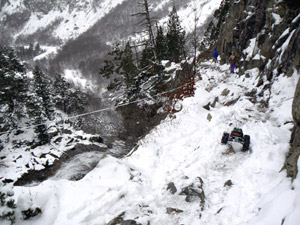 Atravesando una pequeña cascada en el valle del río Aguaslimpias, camino del refugio de Respumoso durante el invierno de 2008.