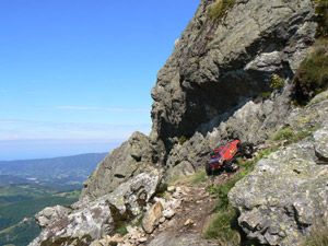 En estas 240 rutas ,el coche ha sufrido tres caídas por la ladera, bajando el Orhi, subiendo el barranco de Culivillas y bajando del balcón de Pilatos al Urederra. Solo la del Orhi, con mas de 100 metros dando volteretas por el aire ladera abajo fue grave y no pudo repararse en el momento , rompio la union del chasis central con el tren trasero. Desde hace bastantes salidas , los pasos expuestos a caidas de dificil detención , los hago con una cinta de seguridad extensible de 8 metros entre el coche y mi cinturón de mochila.