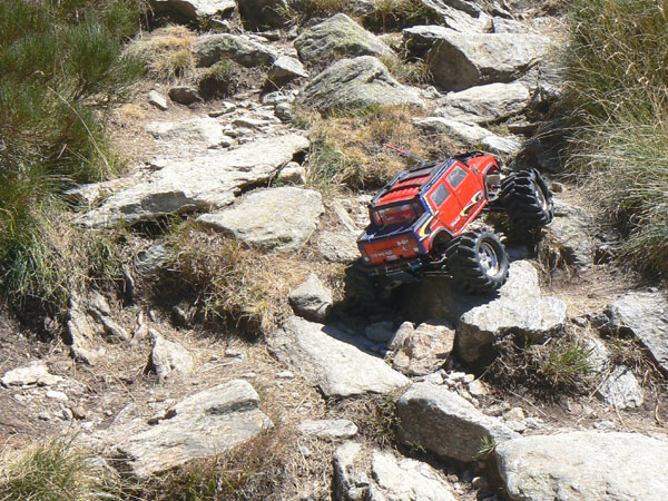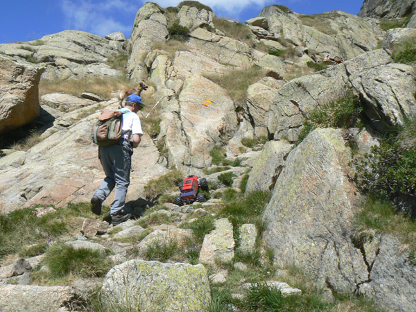 Un poco de escalada a lo crawler? Por supuesto, no hay piedra pequeña que no anuncie otra más grande a continuación , estamos a unos dos mil y pico metros de altitud, nos encontramos con este tramo y no vamos a retroceder. Vaya, que arrastro el Emaxx con mis dientes si hace falta. Es difícil incluso después de haber caminado con el Emaxx a lo largo de 32 rutas de montaña decidir cuando debes seguir y cuando no, prever cuando el sendero va a ir a peor o cuando es un paso aislado. Que yo recuerde solo en dos ocasiones he tomado la decisión de abandonar una ruta en mitad de la subida una fue en la excursión del verano pasado por el valle de Remuñe al encontrarme con rocas del amaño de vacas y desprendimientos de carrizal. La otra a menos de cien metros de la cima de la montaña Petrechema por miedo a un vuelco lateral y caída en picado de más de 200 m. En esta ocasión decido seguir para adelante, hace buen tiempo.., debemos estar a punto de llegar, voy sobrado de baterías. Cualquier excusa es buena para convencer que haces lo correcto. Pues eso, primera y tranquilo para arriba, mejor por piedra todo el rato que intentar subir los escalones