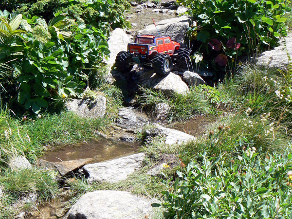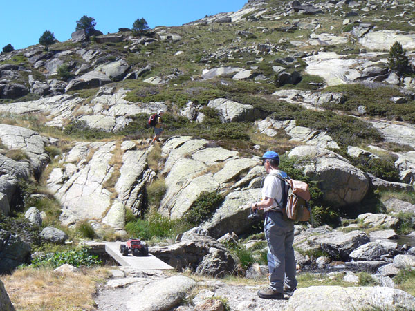 Pasado el segundo puente, fin de pista . Ya hemos dejado la pista de tierra y pasado a la margen derecha del río por un estrecho puente de piedra , siguen unos doscientos metros de ancho camino que pronto cambian hierba por tierra y más adelante por enormes cantidades de piedras , las grandes protagonistas de esta ruta. Piedras de todo tipo y tamaño en medio o a un lado del camino que nos invitan a abandonar en más de una ocasión. De todas formas una vez metidos en faena y yendo bien de tiempo, es cuestión de cambiar de marcha, la nuestra no la del Emaxx, y tomarnos las cosas con calma. No importa que en las guías indique una hora y cuarenta y cinco minutos para llegar al lago, nosotros estaremos disfrutando de un camino trialero por lo menos el doble de tiempo que lo marcado en estas guías. En todas las rutas con coche TT debemos multiplicar el tiempo previsto en las guías por un factor de 1,5 a 2,5 dependiendo de la orografía y contar con una ascensión máxima de 350 metros por hora para senderos de dificultad mediana.