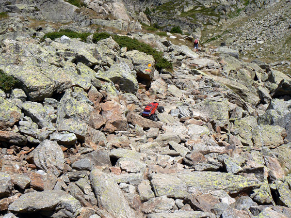 La subida mas fuerte. La subida más bestia está aquí delante, es una especie de couloir o corredor de piedras tuttifruti que te elevan hasta el borde de lago de Juclar , al fondo arriba casi al mismo cielo. No deben ser más de 40 metros de desnivel pero os aseguro que parecen cuatro millones. Y esto no es el principio del couloir, ya llevo un rato crawleando estas enormes piedras en mitad del sendero a tres Km. por hora y un diez por ciento de acelerador. El chaval ya se sienta resignado un poco más arriba esperando otra vez que llegue con el coche. La mujer algo más abajo con la cámara por si el Emaxx decide hacer unos backflips extras. Aquí un backflip viene seguido de otros cada vez más rápidos , altos y seguidos , y eso es mucha bajada. Quizás Genís debiera haber cogido la cuerda de seguridad que suelo atar al coche para las bajadas pero al final lo probé sin seguro. Bueno, el caso es que hay alternativa en la mitad de esa subida, el camino da dos opciones recto arriba o un poco a la izquierda, donde la otra flecha en la pared. Aun me queda algo de seny ( algo parecido a sentido común, razonamiento, en catalán) así que me decido por el menos difícil, que no fácil y después de pasar al lado de Genís giro a la izquierda.