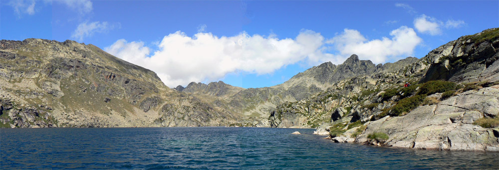 Panoramica con tres fotos de uno de los lagos de Juclar el mas cercano al refugio sacado desde la misma valla de cemento que le cierra el estrecho paso hacia el valle inferior. El refugio esta cerca un poco a la derecha y arriba esta limpio y bien conservado aunque es libre. |
