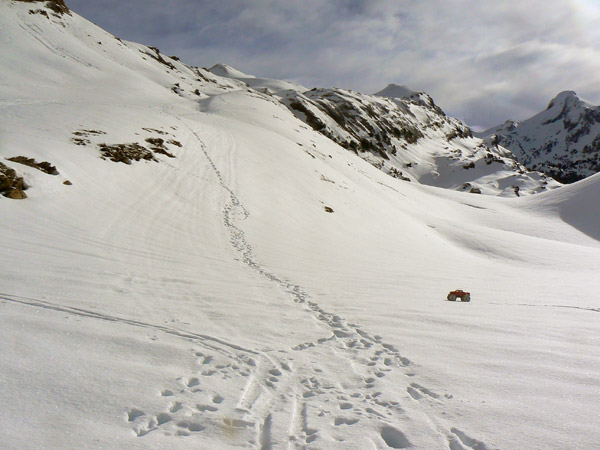 Mira , con buen tiempo aunque sea con frio y hielo no hubiera dudado en seguir hasta el collado del Lakora con el coche pero yendo solo y en estas condiciones no .