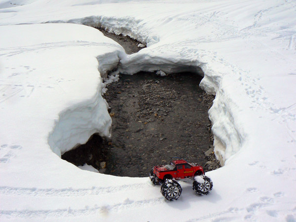 Jugando con los hundimientos de la nieve sobre el rio.