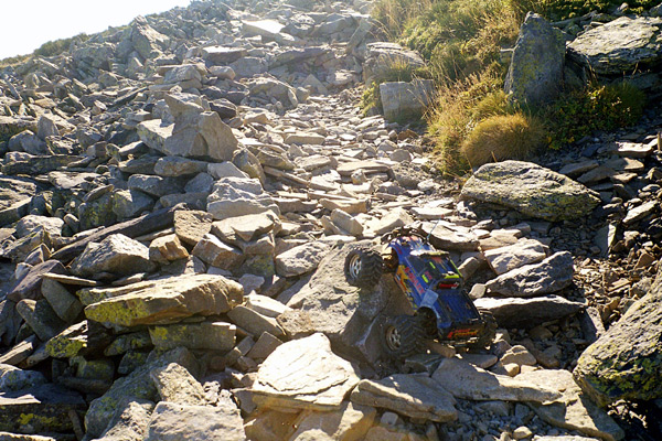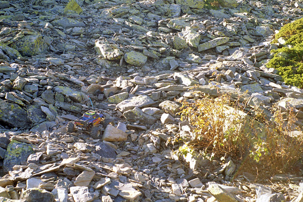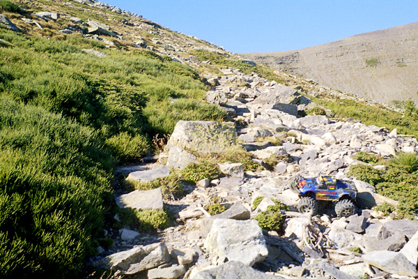 | La bajada es muy interesante pues solo hay que coger el coche a mano en contadisimas ocasiones. No es que sea una bajada de 700 m "a cero" pero casi. Hay tramos lentos , mas rapidos, incluso bien delicados, de los que te hace dudar si apretar el gatillo sin cerrar los ojos. Hay bastantes escalones de 35 o 40 cm seguidos de una fuerte bajada que no puedes bajar despacio. Te arrimas a ellos y justo antes de empezar a bajar el eje delantero das un aceleron y lo saltas. Dependiendo del espacio que tengas delante a veces hay que frenar inmediatamente despues de tocar el suelo. Asi, cuando estaba a poco mas de la mitad de la bajada, en uno de estos saltos y frenazos con inversion de marcha se partio el engranaje libre de la 1ª velocidad en la caja de cambios. Es la segunda vez que ocurre , aunque en la anterior ocasion fue el de 2ª velocidad. Afortunadamente el emaxx puede tirar con una sola marcha, aunque sea la 2º, engranada constantemente. Asi llegue hasta abajo. No hay fotos de la bajada porque la hice bastante rapido y con pocas ganas de parar, solo utilice en ella dos dobles packs de 3000 y aun sobro algo del ultimo . Por otra parte el carrete de la vieja camara analogica se terminó en la cima . A destacar la primera prueba en ruta de las baterias Integy Intellec 3800. Dificil manejo al comienzo . Dan muchisima intensidad de descarga al principio que se transforman bruscamente en derrapadas y perdidas de adherencia. Al cabo de unos 5 minutos ya van mas calmadas y se aprovechan mucho mejor. ,La duracion no me parecio muy superior a las de 3000, pero es que tambien estan dando mas intensidad . Quizas pudiera reservarlas para la bajada en vez de para las zonas mas duras de subida. Con 3800 mah creo que se podrian bajar 700 metros de desnivel sin cambiar.