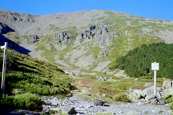 El circo glaciar de San Gaudioso. Hay algún tramo en que el camino ha desaparecido, o simplemente quizás nunca existió. Terminada la subida por el bosque a unos 1800 o 1900 metros de altitud llegamos a este balcon desde el que se ve el Moncayo, arriba en el centro de la foto . La subida normal es por la izquierda de esta imagen hasta llegar al Cerro de San Juan (2280m) seguir el cordal descendente que se ve al fondo y subir finalmente un pequeño tramo casi llano hasta la cumbre (2315 m) En invierno y con nieve es una subida que puede complicar bastante la ascension , en la cresta superior un desliz nos lleva directamente a un salto delante de esas rocas. Tengo intencion de acercarme a esta montaña en temporada invernal con crampones o raquetas y tras unas primeras pruebas de neumaticos con clavos que tengo que hacer antes en nieve dura y sobre hielo. En esta ruta como veremos, la dificultad no esta en la cima por si misma sino en acercarse a ella superando la pared del circo. |
