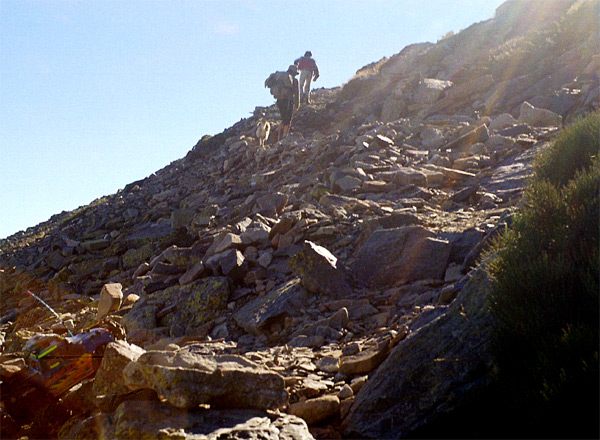 Una maravilla este camino. Seguimos subiendo el sendero entre bloques que nos llevaran al collado entre los dos picos . Hay alguna parte del recorrido verdaderamente curiosa, como estas losetas que parecen colocadas cuidadosamente para que ningun bloque sobresalga mas que otro. Se sube muy bien este cacho. Te anima. Sin lugar a dudas el