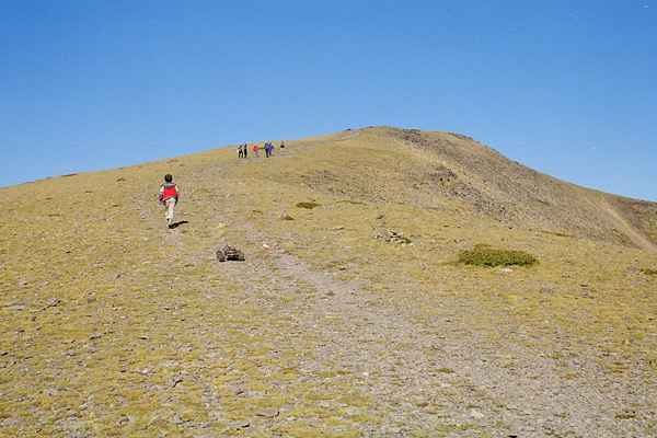 El descanso, el regreso y la rotura del cambio de marchas. La cumbre vista hacia la direccion en que se llega a ella, llano verdad? En realidad TODO es la cima, es una gran elevacion muy diferente a las que estoy acostumbrado a ver en los Pirineos.. Ese montecito al fondo es el Cerro Ssan Juan , solo 35 metros por debajo de esta cima, punto de paso casi obligado bien a la ida o al regreso . Entre los dos y a la izquierda de la imagen la caida hacia el circo que acabamos de subir , bastante peligrosa con nieve o hielo ya que un resbalon te escupe hasta unas rocas y terminan con una caida a plomo.