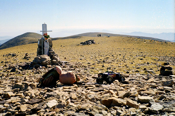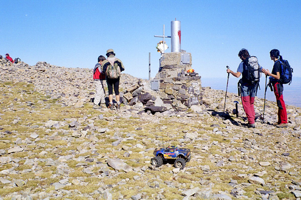 Santuario del Moncayo Subida al Moncayo con un coche 4x4 electrico de radio control . En ese parking junto al santuario del Moncayo, podemos dejar el coche 1/1 e iniciar la subida que nos llevara hasta la cumbre a 2315 m Esta vez voy totalmente "a vista" , es decir, sin haber estado nunca antes en esta zona y por supuesto sin la mas remota idea de que se pueda llegar a la cima con el Emaxx excepto por una nota de un aficionado de Aragon en el foro de Cochesrc. No va a empezar muy bien la cosa: Una averia en el primer minuto , a mitad de excursion una parada a 100 m de la cima y en la bajada una rotura de un engranaje del cambio de marchas . Hasta la maquina digital se averió ,una Nikon 5400. Estas fotos estan sacadas de una camara de las de pelicula , ya obsoleta y que no utilizaba desde hacia años , asi que tras escanear los negativos no han quedado muy bien . |