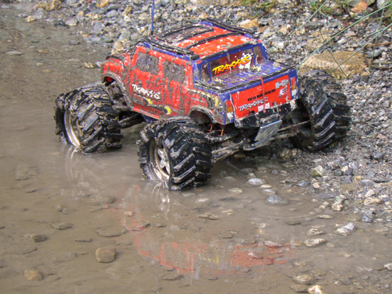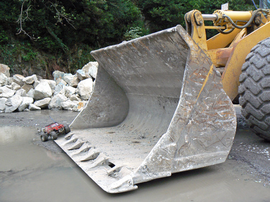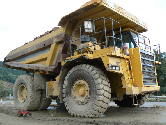 Si hay una bestia en este parking que pueda hacer callar el rugido de los Volvo A40D es esta. Un Komatsu HD 465 que llega a pesar 100.000 Kg cargado, lleva un motor de 23 litros y que da 715 HP necesarios para mover semejante masa. Hace pocos dias la oí ponerse en marcha y más parecía el arranque de una gran maquina de tren que el de un camion. Algunos datos curiosos: Serán necesarios 780 litros (206gal) para llenar el depósito de combustible , 95 litros para llenar cada diferencial y comprar 12 latas de 5 litros si vais a cambiar el aceite motor. El pequeño Hummer rojo funciona con dos baterias de 7,2V en serie y 4200Mah de capacidad alimentando dos motores Titan de 14,4V y pesa poco mas de 5 Kg . Es suficiente con 3cm3 de grasa para rebosar el diferencial . Aunque no lo parezca en esta foto, la carroceria está a escala 1/8, un Hummer a tamaño real apenas llegaría a la parte superior de los enormes neumaticos de más de 2 m (> 6.5 f) de altura.. A pesar de esto el Emaxx casi se queda clavado debajo del arnes de acceso a la escalera de subida frontal de la cabina. El camion estaba cargado con tierra . Soltaba agua de la caja de carga y había formado una capa de lodo muy líquido bajo el motor y la escalerilla . Uno de estos charcos casi se traga al Emaxx hasta el portabaterias.